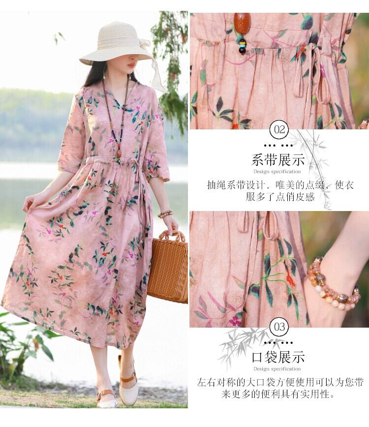 綿麻七分袖ワンピース 夏風 ゆったり 大きいサイズ レトロ風 レトロ柄 膝上着痩せ Vネックリネンロングスカート コットン 大きめサイズ サマー 夏物 sine40137131918