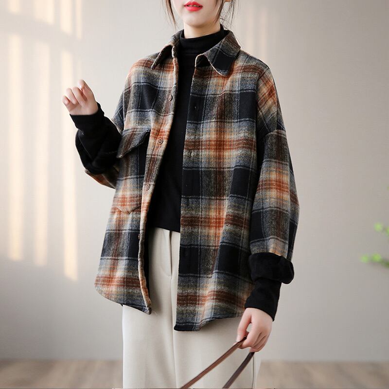 のハイエンドのeign trade輸出ブランドの女性の大きいサイズのチェック柄のウールの厚い起毛長袖シャツジャケット ロング 大きめサイズ sine8710449059