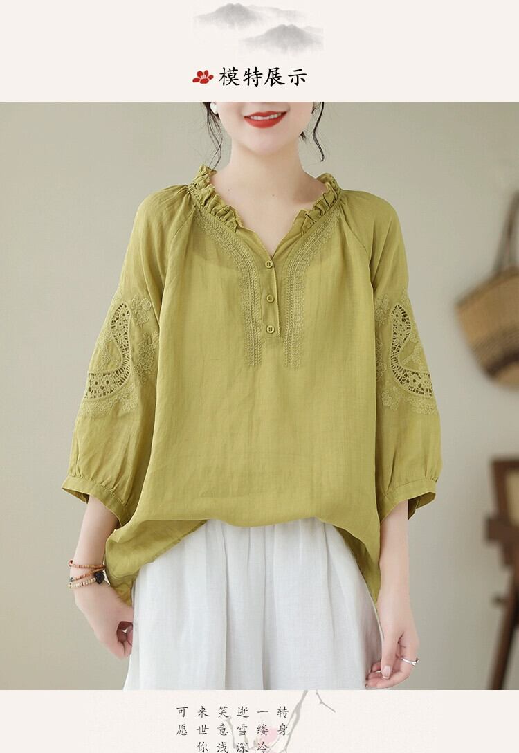 カウンタークリアランスグッズ 刺繍かぎ針編みコットンとリネンシャツ レディース ルーズ Vネック リネンシャツ トップス 薄手 レッド sine10973287376