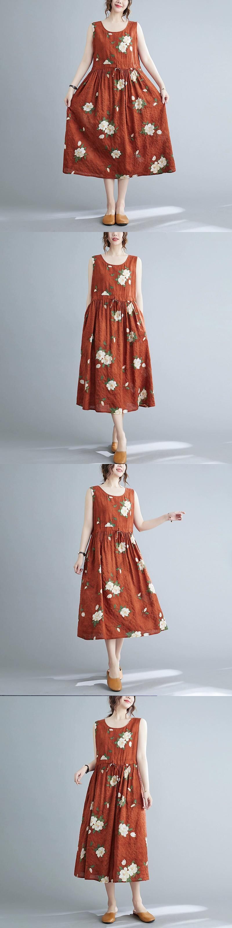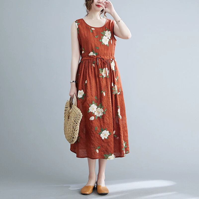 ファットガールコットンとリネンのベストドレス夏ルーズ大きいサイズレトロプリントウエストレスノースリーブリネンミッドレングススカート 大きめサイズ サマー 夏物 sine90972797770