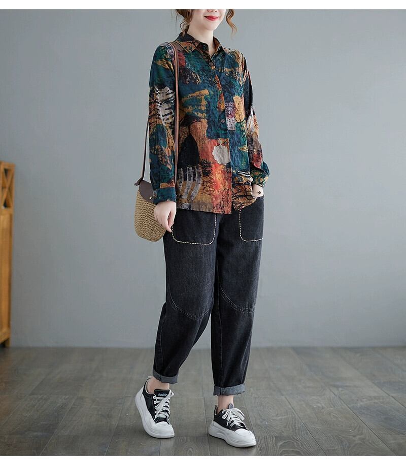 春先の新しい大きいサイズの女性の綿とリネン長袖シャツルーズファット MM レトロ塗装プリントカジュアルリネントップス ロング コットン 大きめサイズ スプリング 春物 sine65338203253