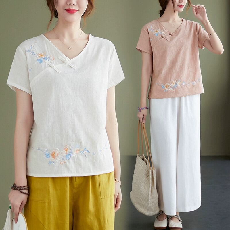 コットンとリネン半袖 Tシャツ女性 2021 夏ルーズ大きいサイズ気質レトロ刺繍ディスクボタン斜め前立てリネンシャツトップ レッド 大きめサイズ サマー 夏物 sine9237963732