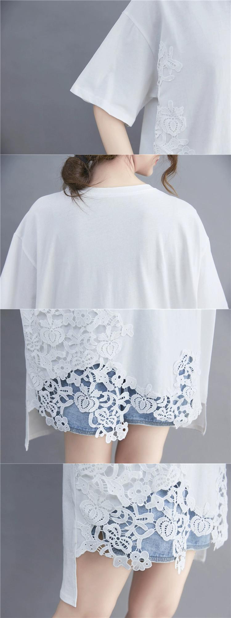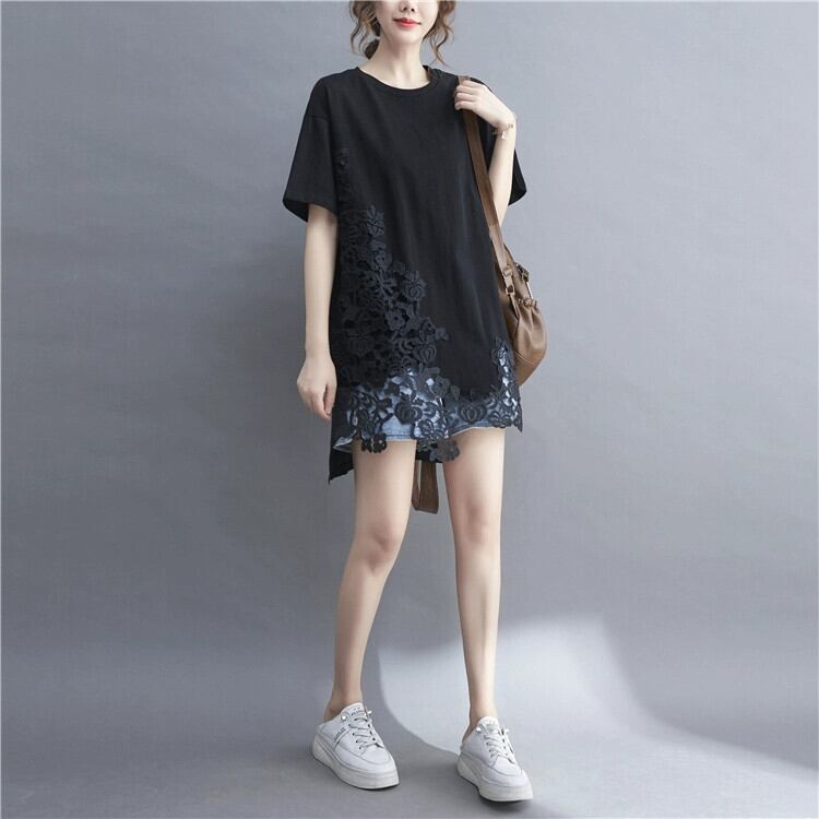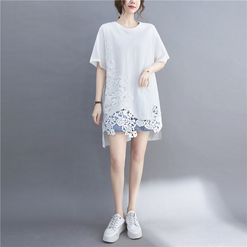 甘いフックパターン中空半袖 Tシャツ女性の夏 2021 ルーズファット mm ソリッドカラーミッドレングストップスプラスサイズの婦人服 大きめサイズ 大人ガーリー スウィート キュート カジュアル サマー 夏物 sine77332699036