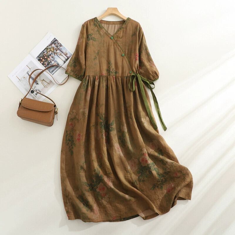 クリアランスカウンター最後の在庫レディース V ネックラミー花柄ドレスルーズレースアップコットンとリネンのロングスカート Vネック sine1371642576