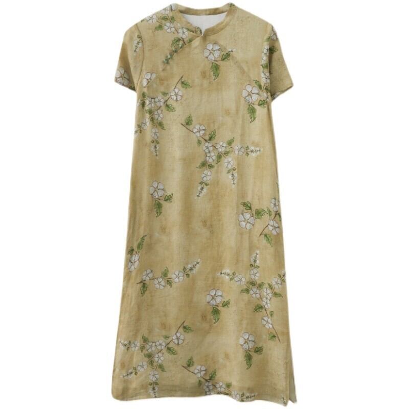ビッグブランドテールグッズのクリアランスカウンター除去レディースレトロプリントコットンとリネンチャイナロングスカートルーズ斜めラペルラミードレス sine5493465186