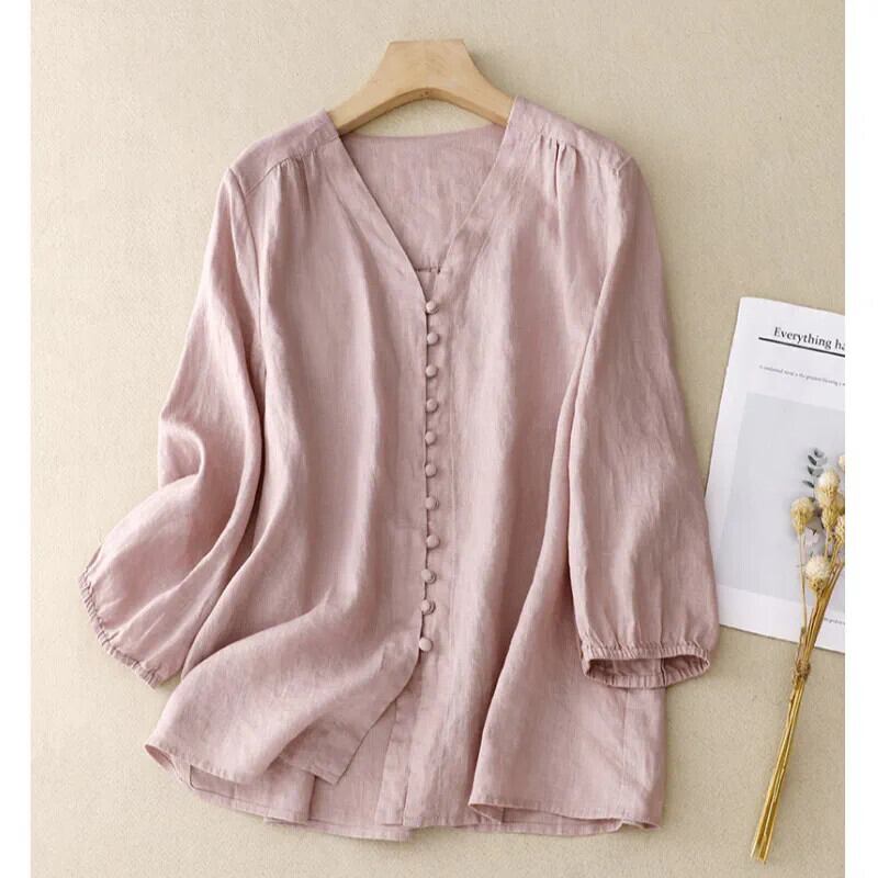 eign trade ese オリジナルビッグブランド撤退女性のルーズ V ネックコットンとリネンシャツ夏のライトリネン七分袖トップ サマー 夏物 Vネック sine30505075059