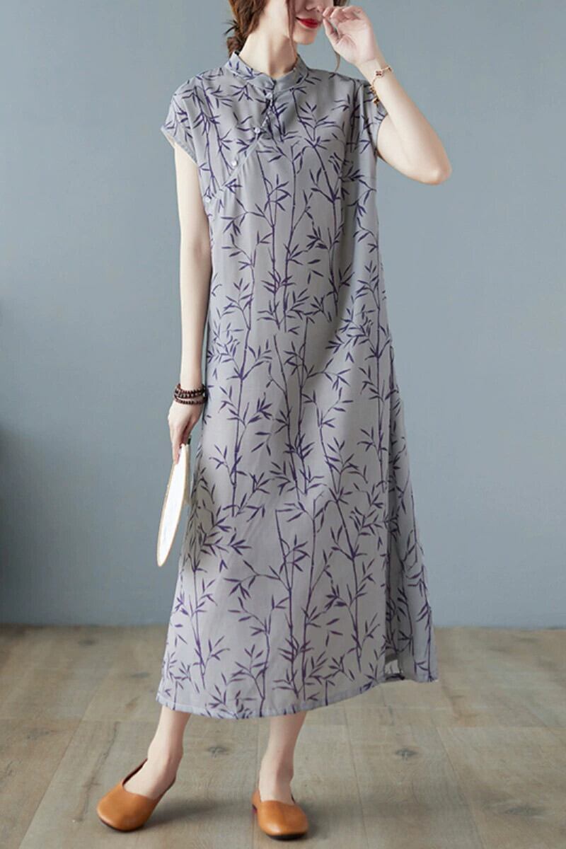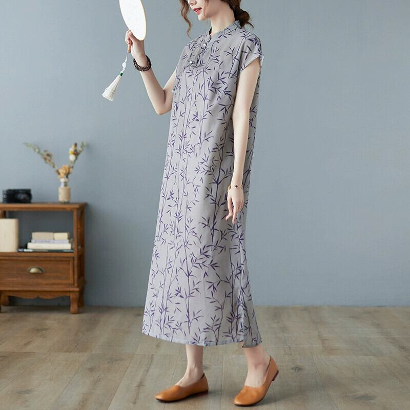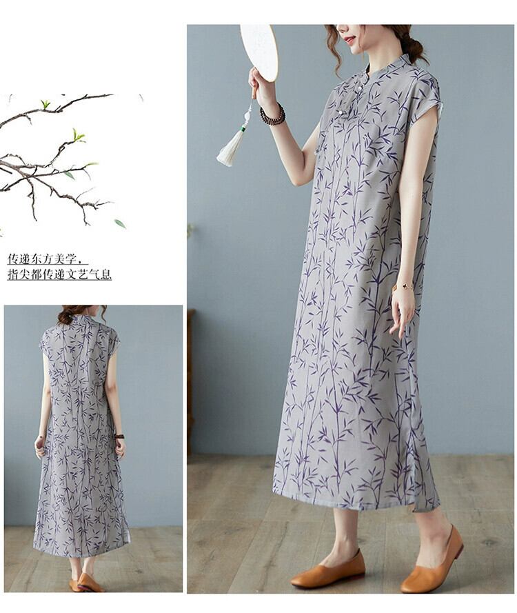 エスニックスタイルの綿とリネンのドレスの女性 2021 夏緩い大きいサイズスタンドカラープリント気質中国風膝上ミッドレングススカート コットン 大きめサイズ サマー 夏物 sine68366945323
