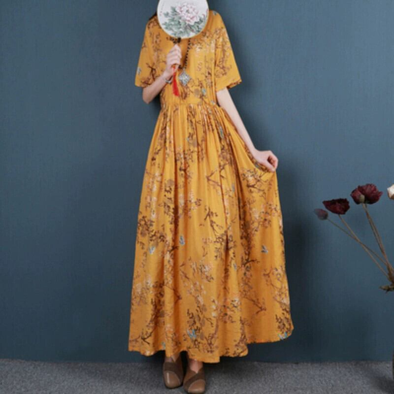 孤児および漏洩ブランドクリアランス eign trade ハイエンドの女性のレトロな綿とリネンの長袖ローブ半袖プリントリネンドレス ロング コットン sine21047092031