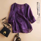 特別オファー〜コットンとリネンの半袖シャツの女性の夏ルーズな大きいサイズのレトロなレースのVラミーリネントップ 大きめサイズ サマー 夏物 sine67690755784