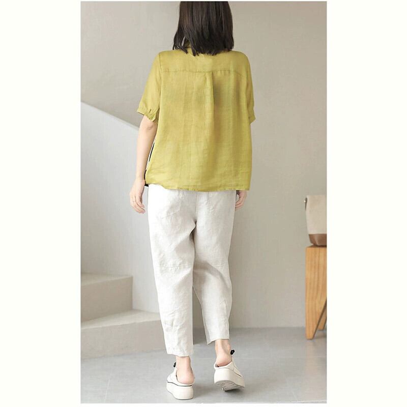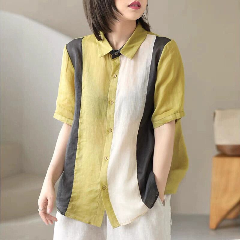 クリアランス漏れ〜カウンタービッグネームアイントレードカット品レディースレトロコントラストカラー薄手トップコットンリネン半袖シャツ sine17468969775