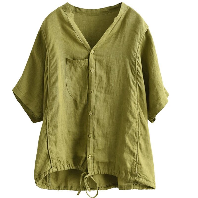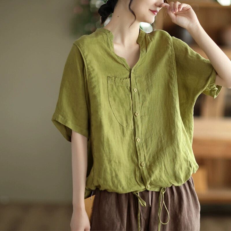 漏れを拾ってください!有名なエサスタイルの綿と麻の半袖シャツ、女性用のゆったりとしたレトロな V ネックのラミートップスの削除に対抗する コットン Vネック sine68889410117