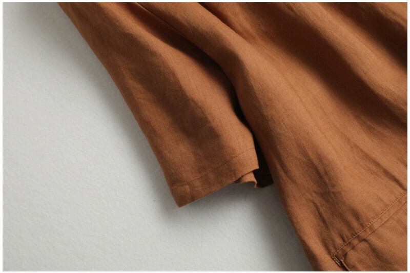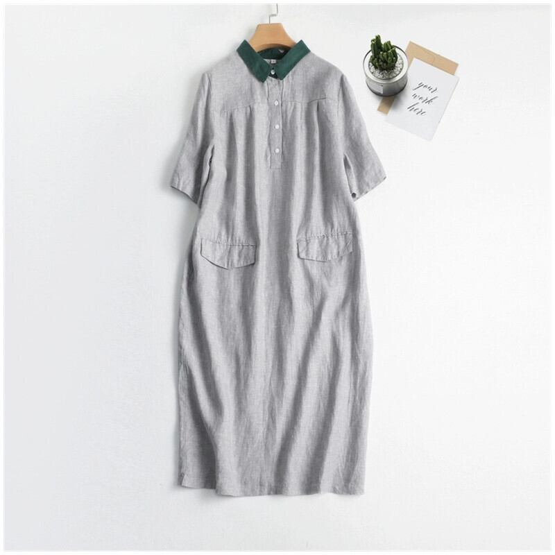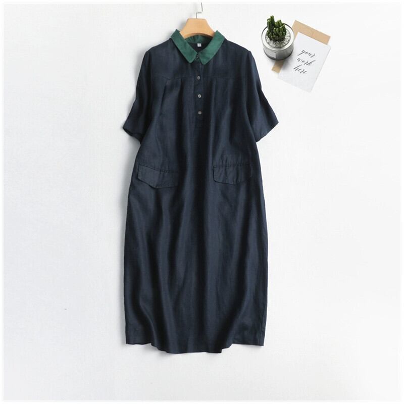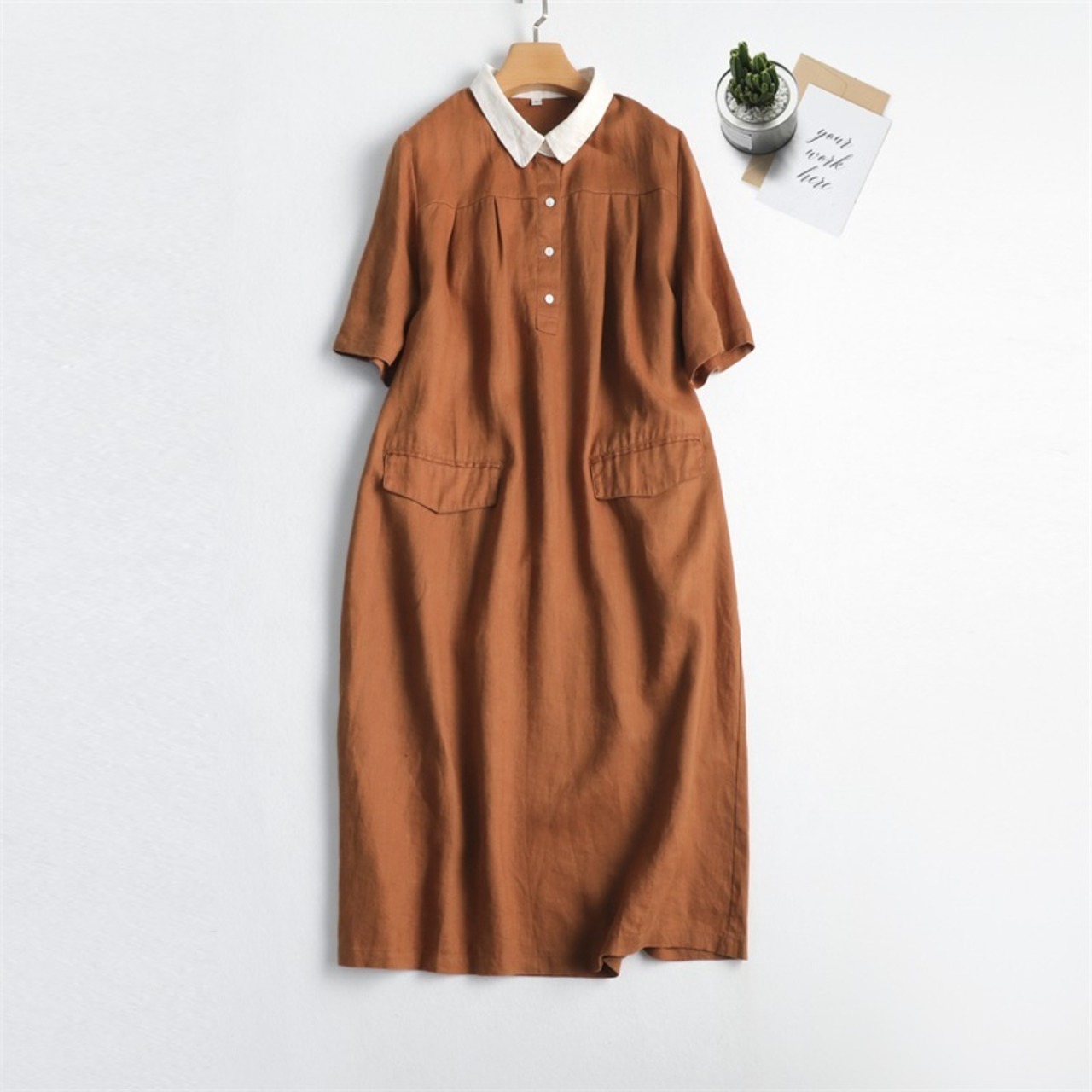 クリアランス漏れ〜カウンターに並ぶ有名ブランドのコントラストカラーのリネン半袖シャツドレスの女性、ゆったりとしたコットンとリネンのラペルのミモレ丈スカート sine9499358692