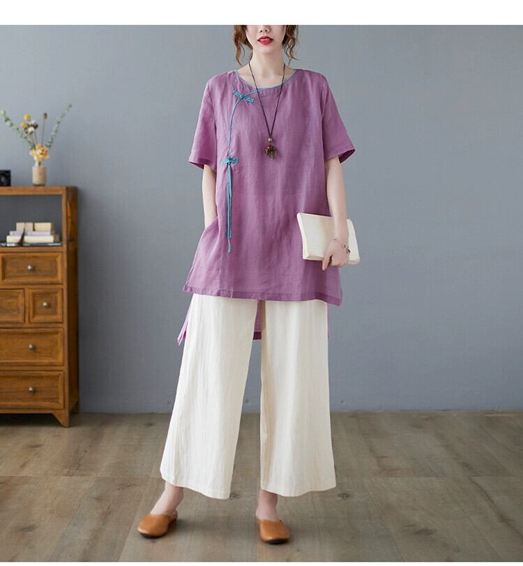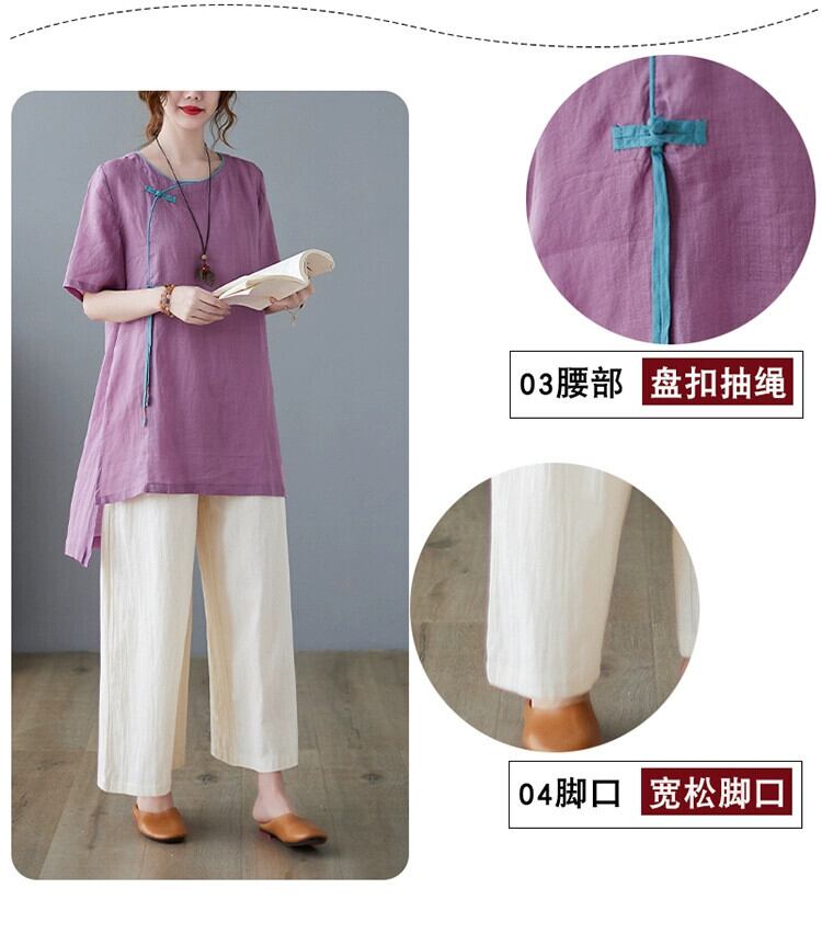 エスニックスタイル綿麻スーツレディースミドル丈不規則バックルシャツジャケットカジュアルワイドパンツリネンツーピーススーツ コットン sine479789294