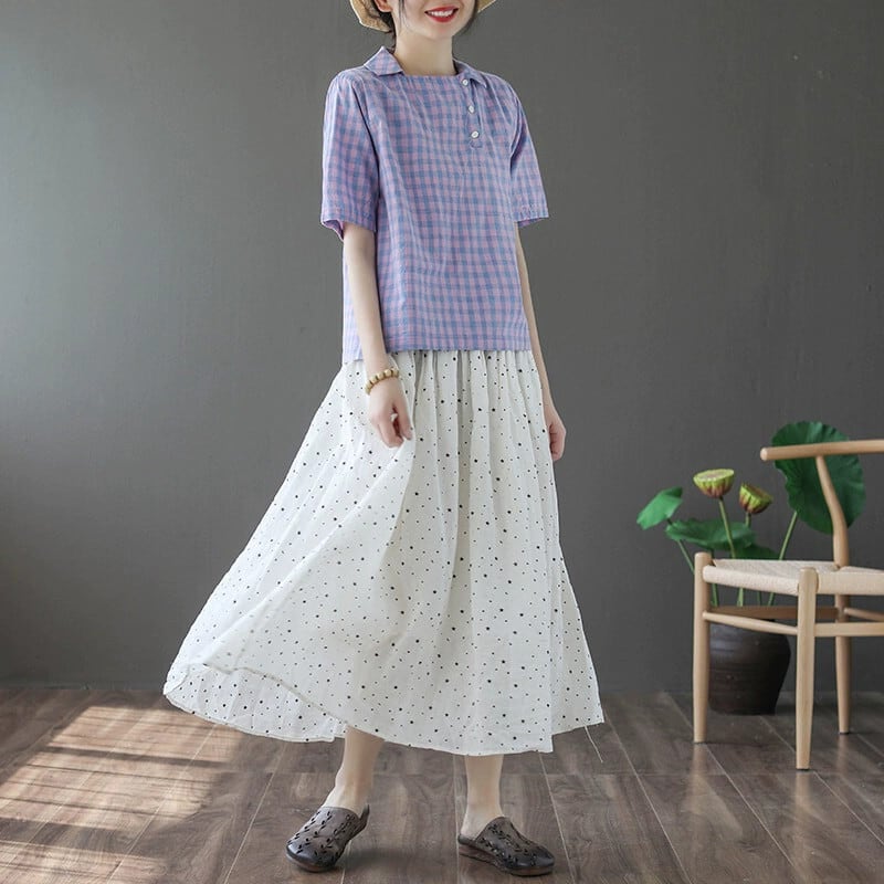 eign trade ese and tailグッズ、激安特価、レディース夏綿麻半袖Tシャツ、レトロラペルチェック柄リネントップス コットン サマー 夏物 sine88057374635