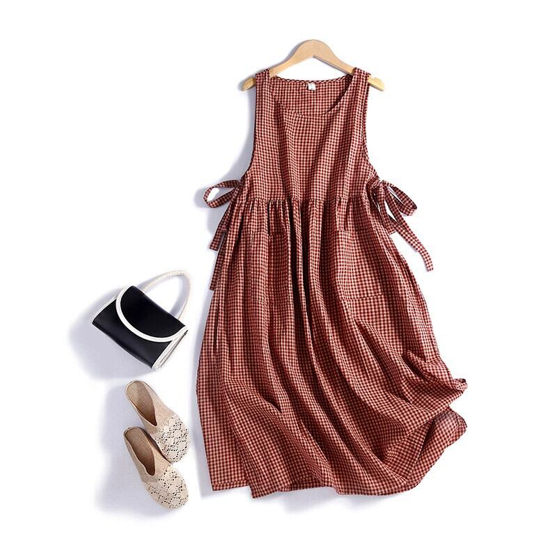 ディスカウント ストア、ショッピング モール、キャビネットの取り外し、カットラベル、婦人服、リネン ベスト、ロング スカート、ノースリーブのチェック柄のコットンとリネンのドレス sine98201606124
