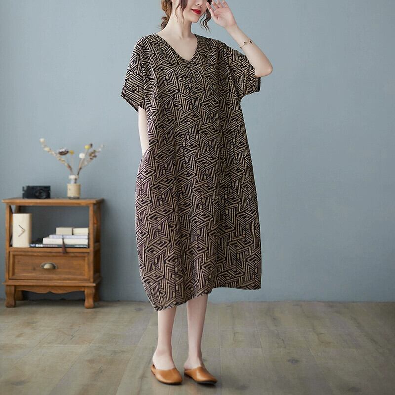 西洋風レトロプリントワンピース夏ゆったり大きいサイズ脂肪がお腹をカバーしてスリムに見える半袖Vネックリネンミモレ丈スカート 大きめサイズ サマー 夏物 sine17798060171