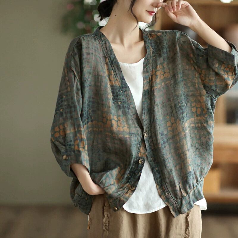 クリアランス漏れ~eign trade eseスタイルカットラベルレディースプリント薄手コットンリネン日焼け止めシャツジャケットトップラミーVネックシャツ sine14352364110