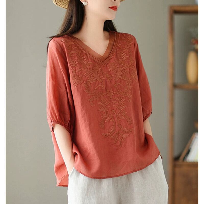 Eign Trade Export Big Tail Goods 撤退レディース刺繍 V ネックコットンとリネンシャツルーズで軽いリネン半袖 T シャツトップ レッド Vネック Tシャツ sine75080277572