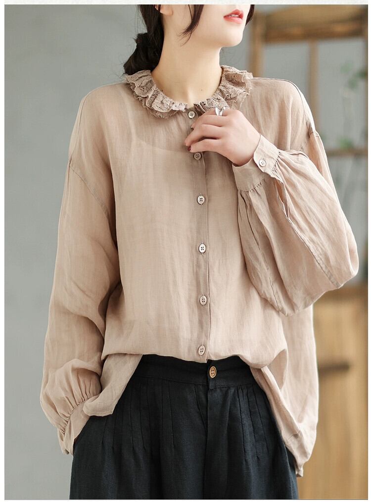 クリアランス牛カウンターは女性の軽量リネン日焼け止めトップレースラペルコットンとリネンの長袖シャツを撤回します ロング sine3083485292