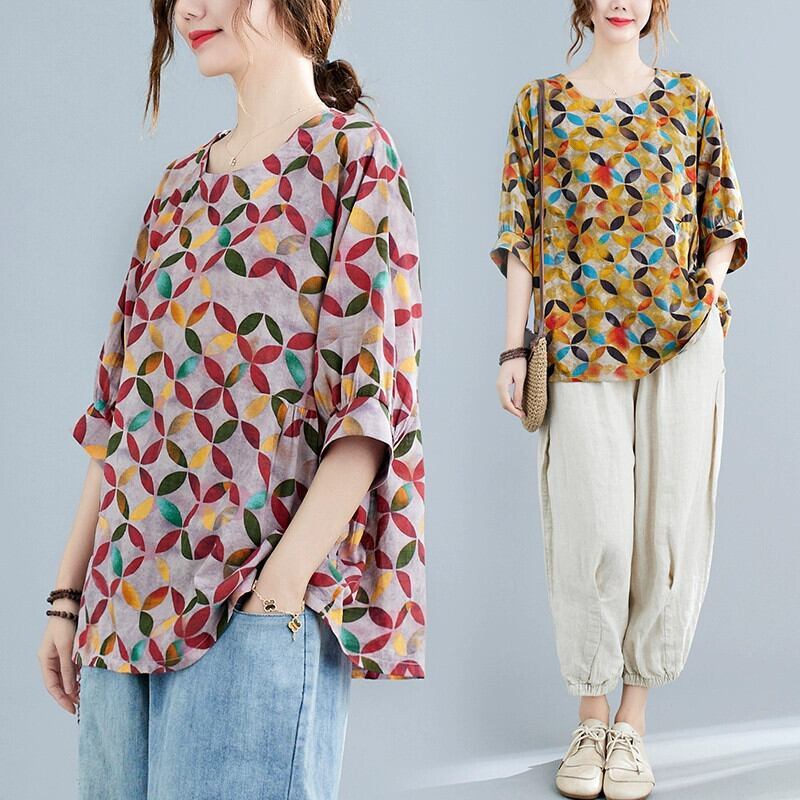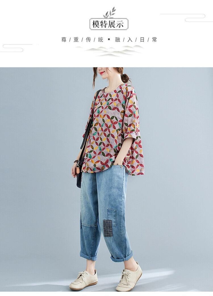 年齢を減らすプラスサイズの女性の半袖 T シャツ夏 2021 新しい緩い脂肪 mm 文学プリント薄い綿とリネンのトップ コットン 大きめサイズ サマー 夏物 Tシャツ sine32186721434
