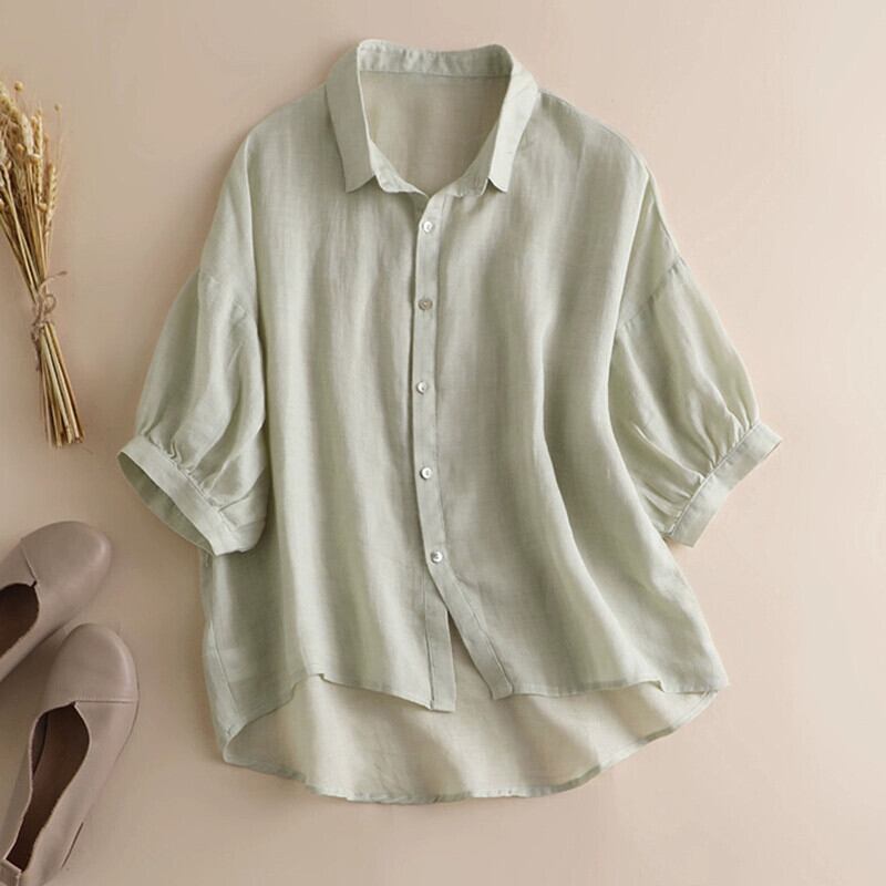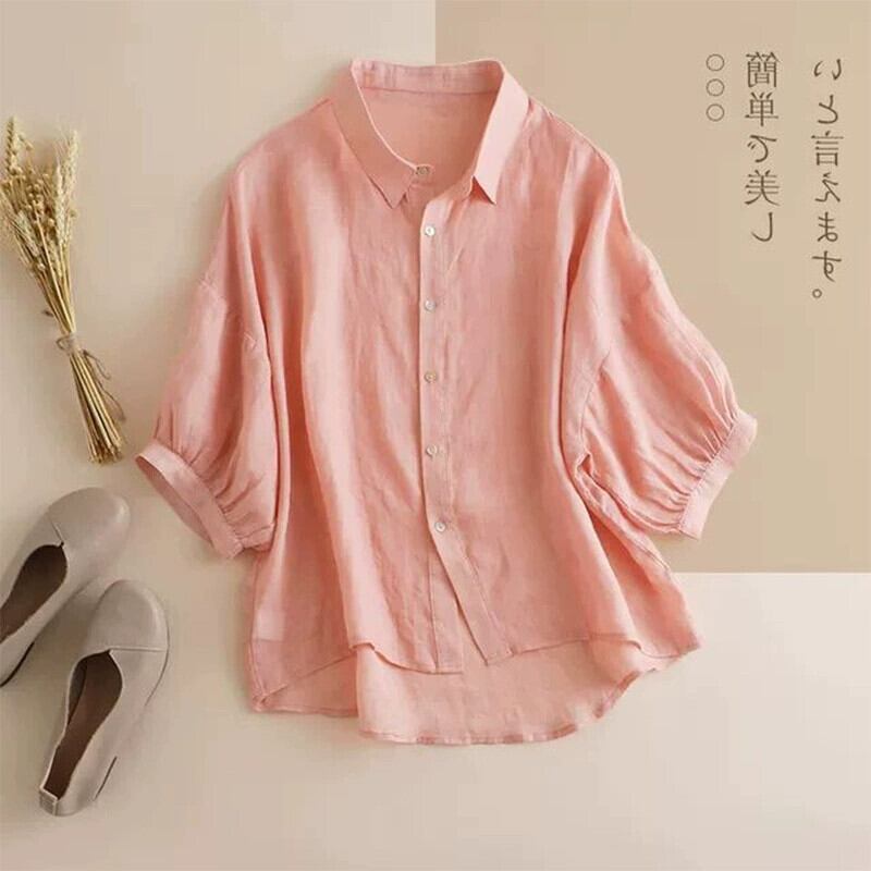 特別オファー〜エドコットンとリネンの半袖レディースシャツ、芸術的でルーズなカジュアルな薄いランタンスリーブのリネントップス sine3988468310