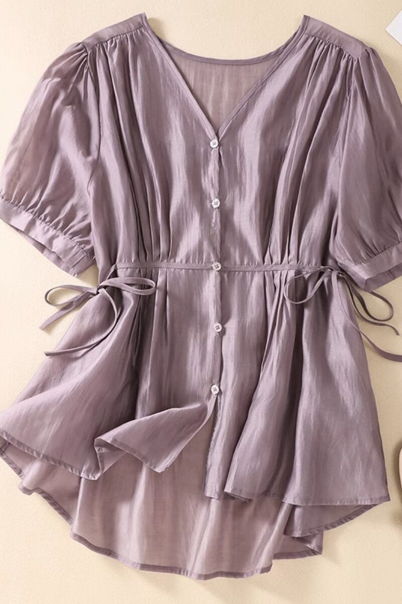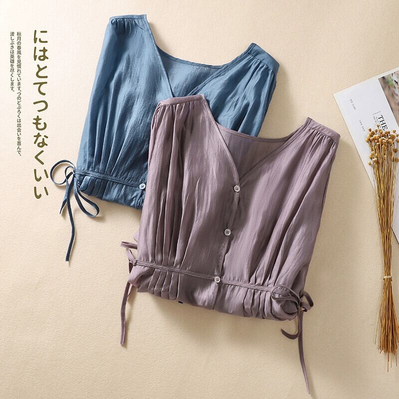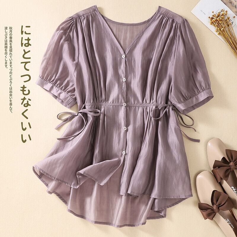 eign trade ese オリジナルハイエンドブランド薄手ラミー半袖シャツレディース夏ルーズウエストレースアップリネントップ サマー 夏物 sine45882294065
