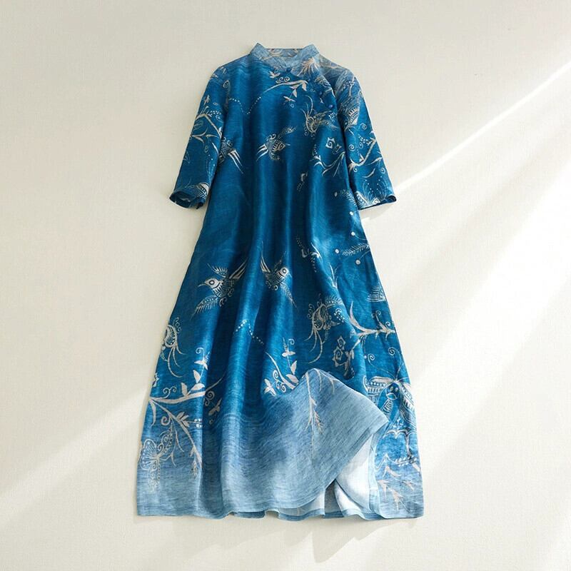 ディスカウント ストア ショッピング モールの女性の中国風チャイナ ラミー ロング スカート改良された斜めプリント綿とリネンのドレス コットン sine31155296689