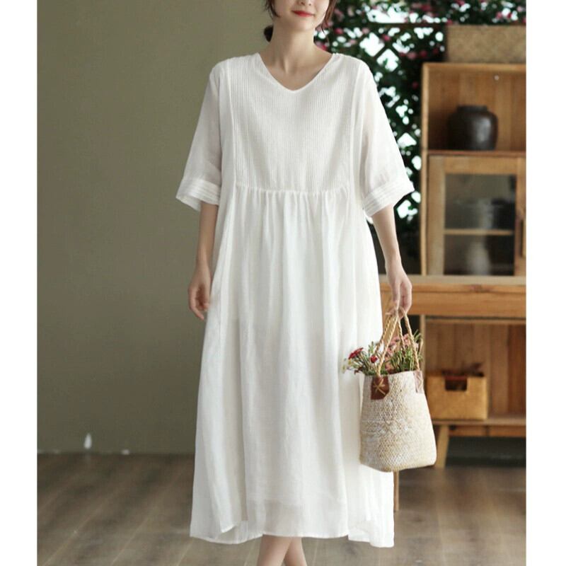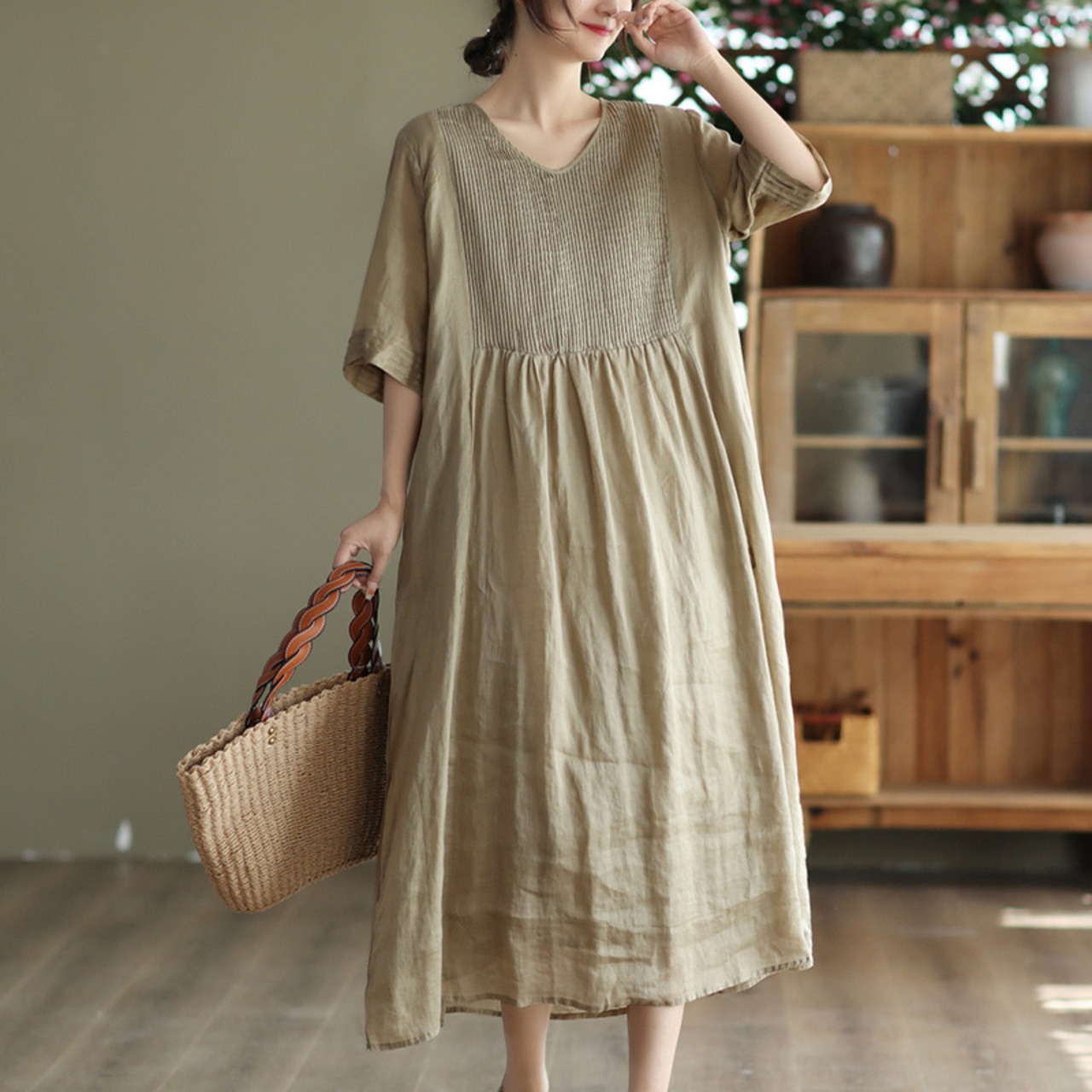 ディスカウント ストア ショッピング モールの女性の文学アコーディオン プリーツ コットンとリネンのドレス ルーズ V ネック リネン ミドル丈スカート夏 サマー 夏物 Vネック sine1378124008