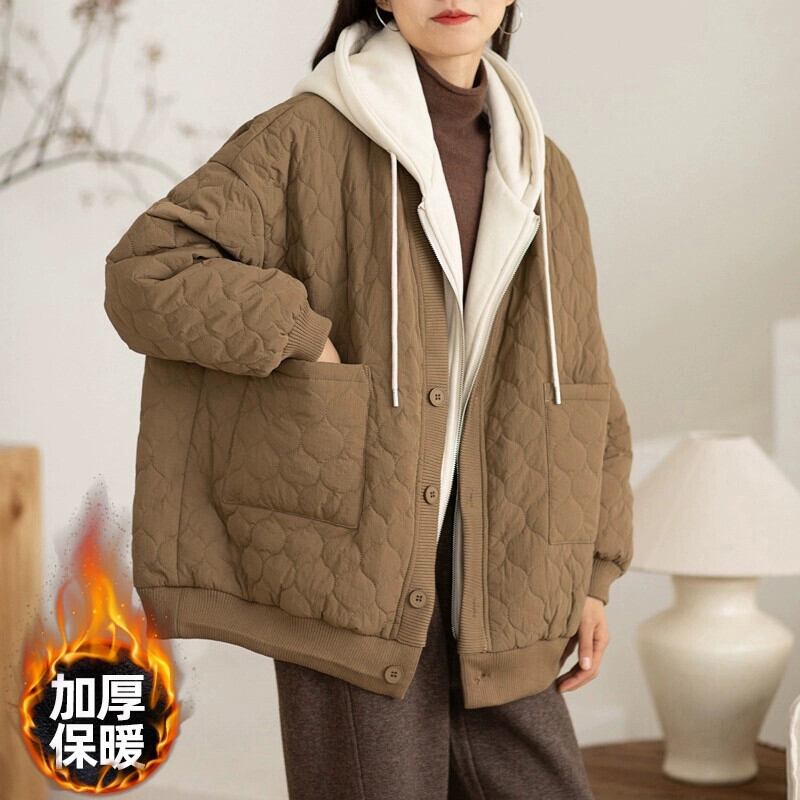 秋冬の薄いダウンパッド入りジャケットの女性、ゆったりとした大きいサイズ、厚くて暖かい、レトロな菱形のフード付きスプライシングフェイクツーピースコート 大きめサイズ オータム 秋物 ウィンター 冬物 sine55251871570