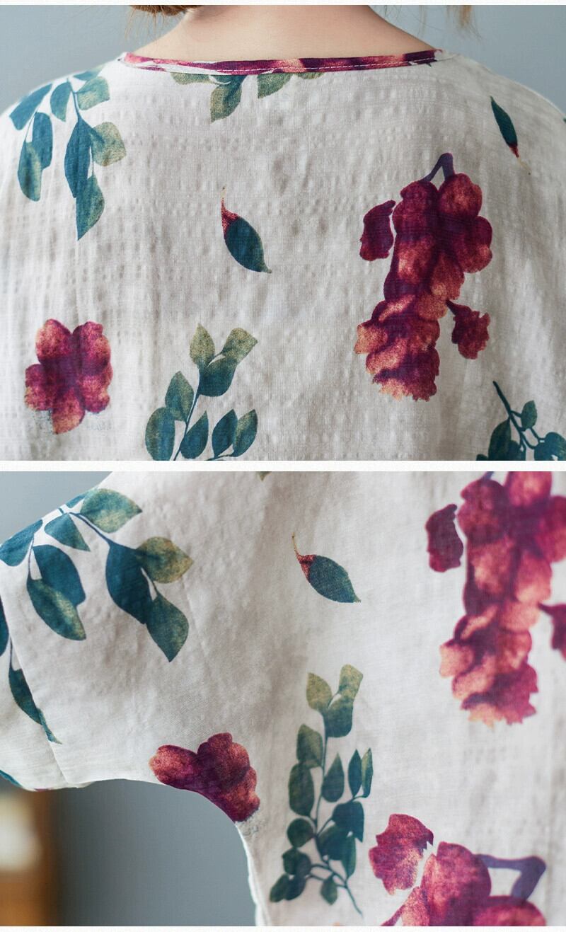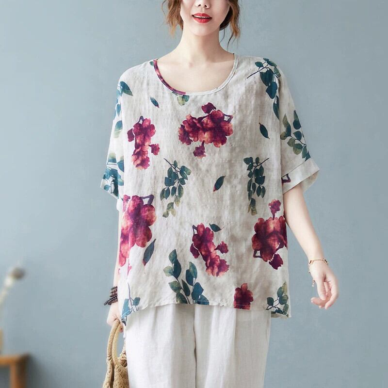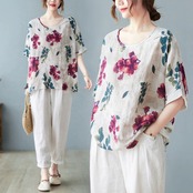 200 ポンド綿とリネン半袖 Tシャツ女性夏ルーズ大きいサイズ脂肪姉妹ファッショナブルなレトロなパターン薄いリネンシャツトップ コットン 大きめサイズ サマー 夏物 sine99729378270