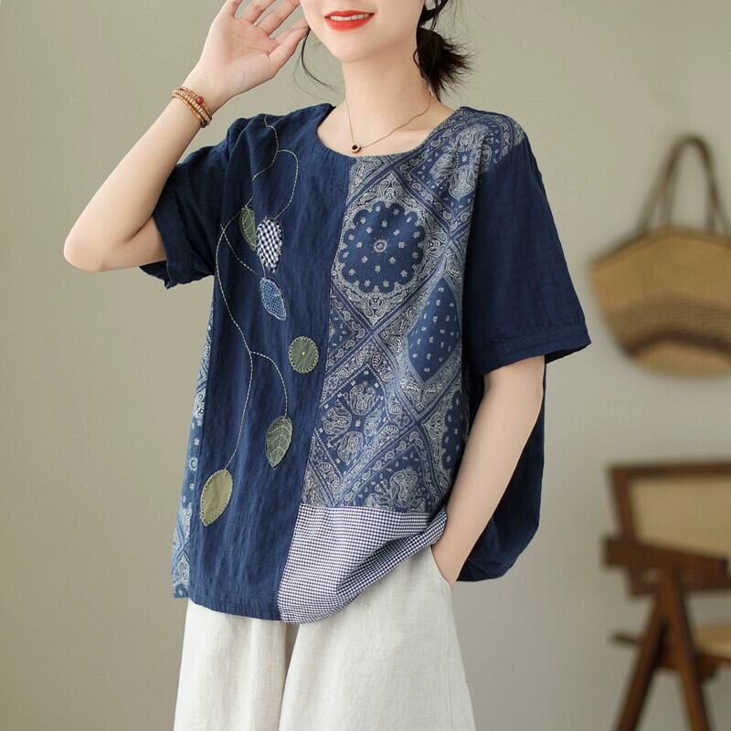 eign trade 割引ブランドテールグッズ女性のエスニックスタイルプリントラウンドネックトップス Tシャツルーズカジュアル半袖 Tシャツ Oネック sine14997972719