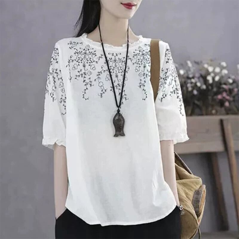 年齢を減らすためのクリアランス〜カウンターは永続貿易カットラベルを撤回しました女性の夏のレトロプリントリネントップルーズコットンとリネン半袖Tシャツ サマー 夏物 sine70916372850