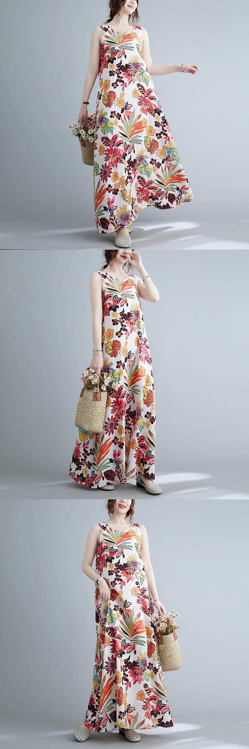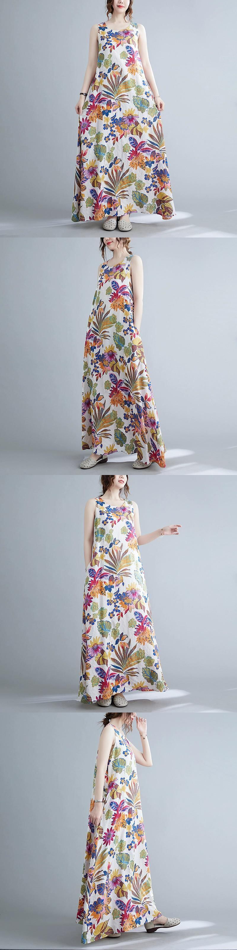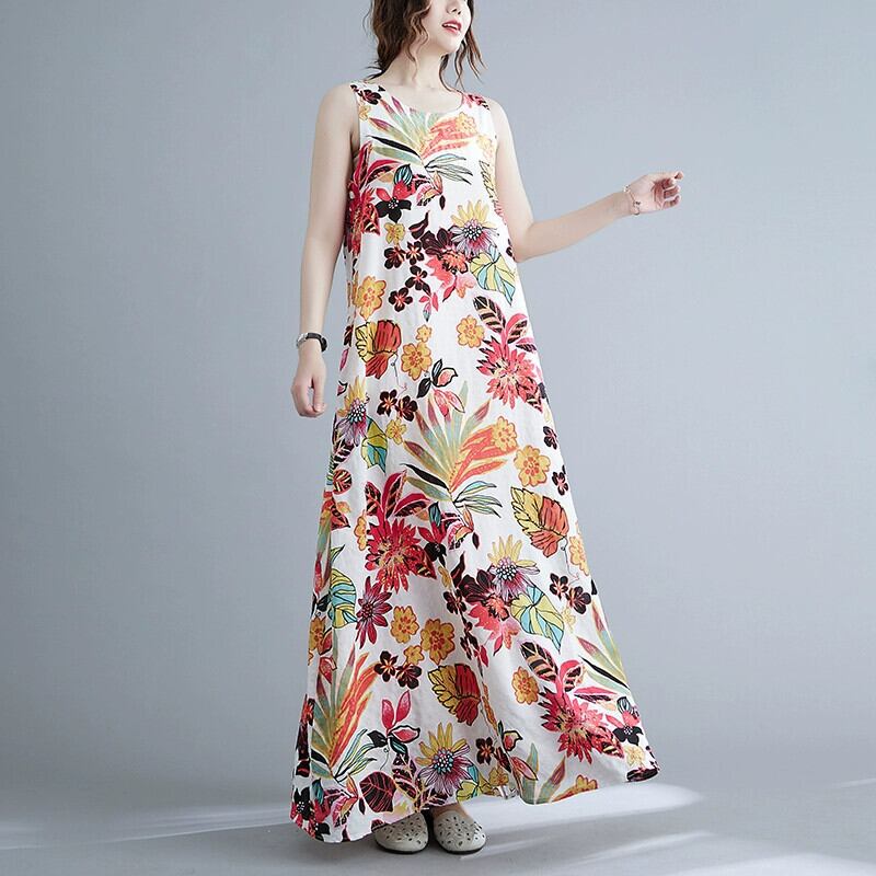 2022 夏の綿とリネンドレスルーズ大きいサイズエスニックスタイルレトロプリント通気性スイングキャミソールローブ コットン 大きめサイズ サマー 夏物 sine85642222315