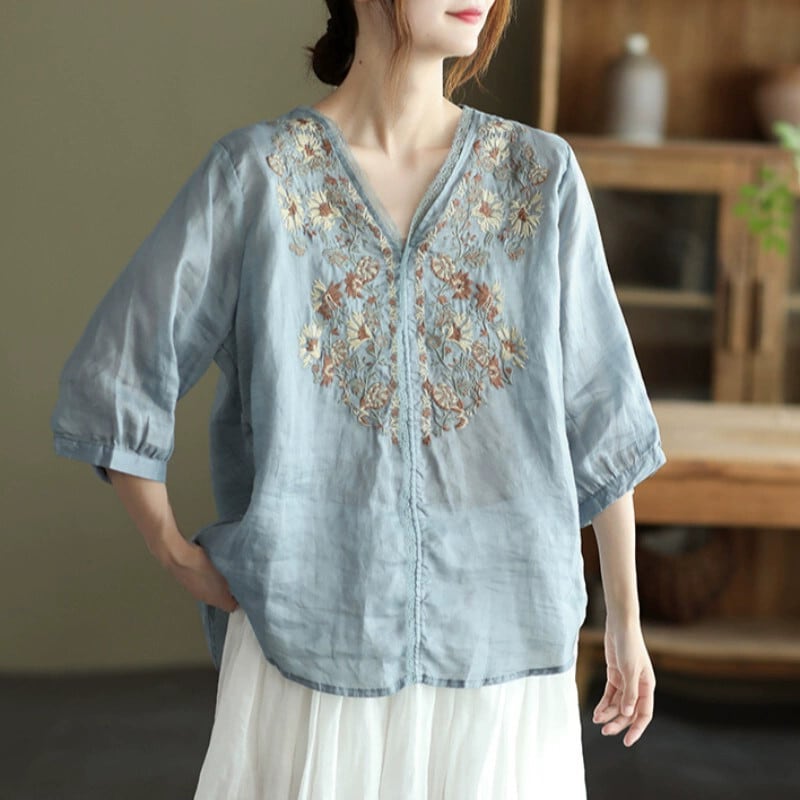 クリアランスリーク〜ブランドカットラベルレディースエンドストックレトロVネック刺繍ラミートップルーズコットンリネン半袖シャツ レッド sine6517869313