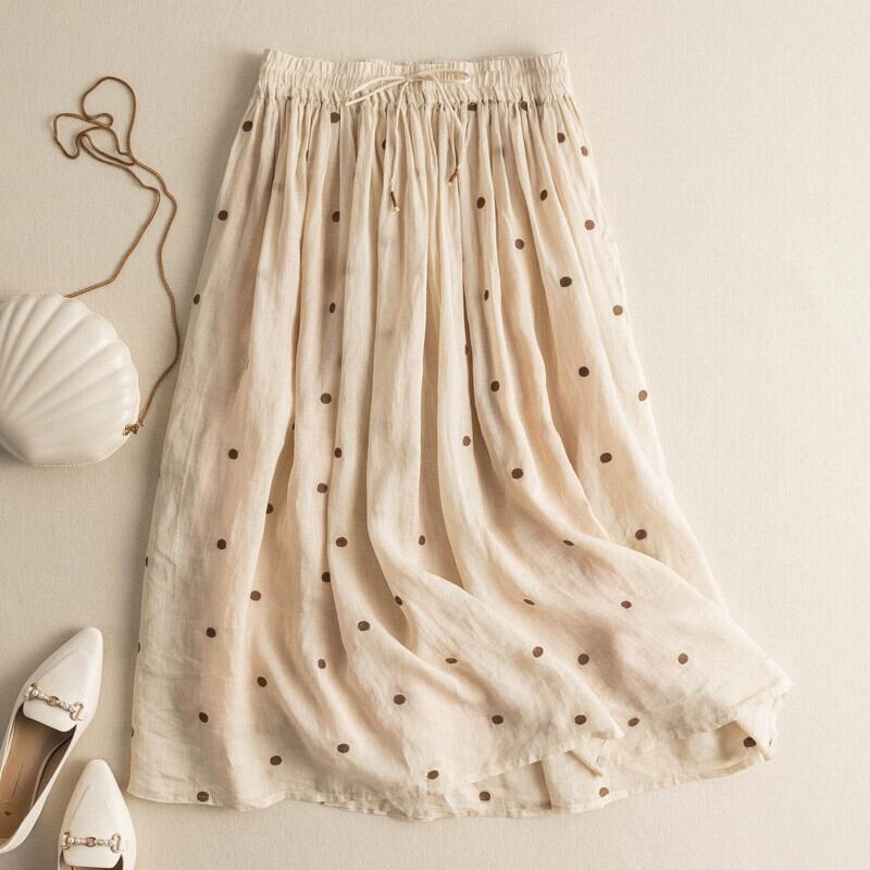 Eign Trade Export Big シングルカットレディース二層ラミー A ラインスカート、大きな裾付きコットンハイウエストリネン水玉スカート Aライン sine5829021454