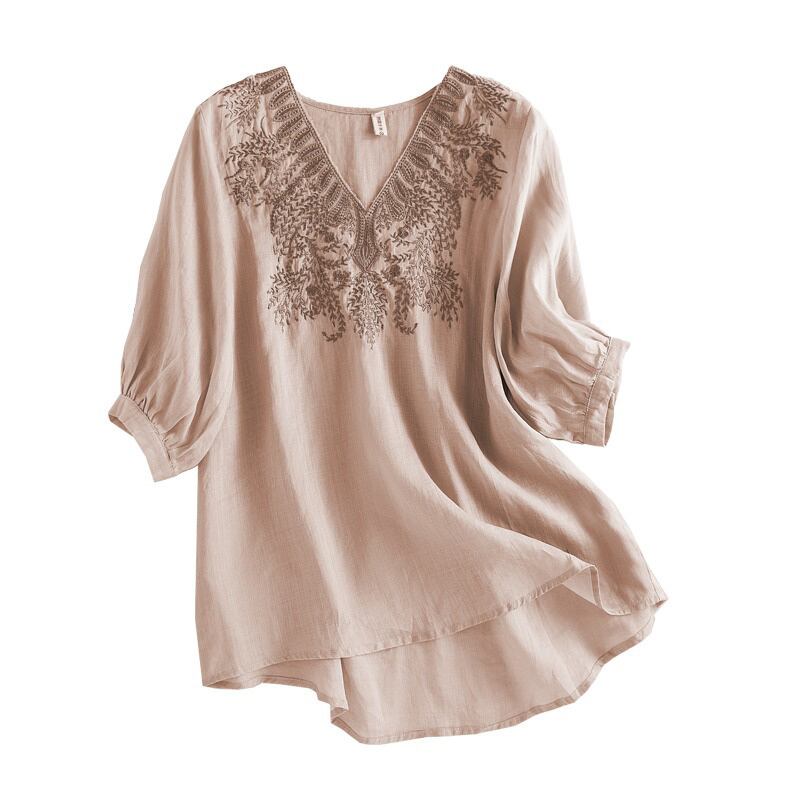 第一線のブランド eign trade カットオフ女性スタイルの刺繍綿とリネン半袖シャツルーズ V ネックラミー薄手のトップ レッド コットン Vネック sine32050406935