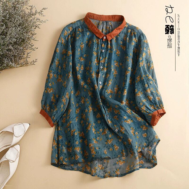 eign trade ese オリジナルビッグブランドカットラベルコットンとリネンシャツレディースカジュアルレトロプリント七分袖薄手リネントップ sine46220230119