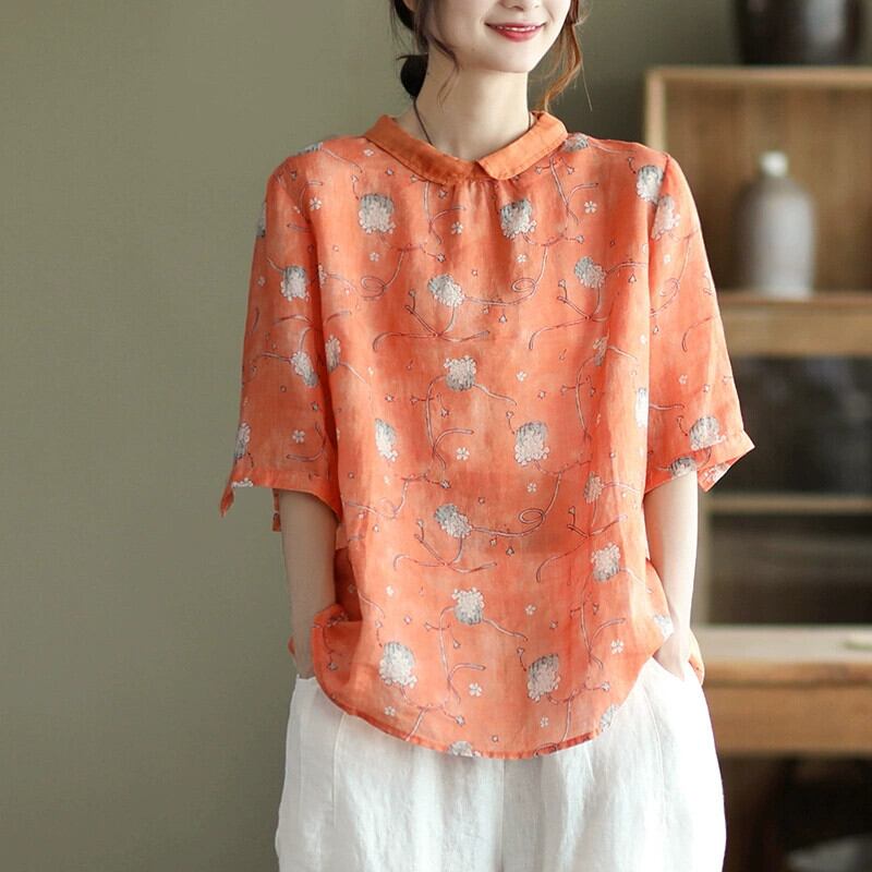 eign trade イタリア高級ブランド カットレーベル リネン 半袖 レディース シャツ 花柄 ドールカラー ラミーコットン トップス sine10775889357