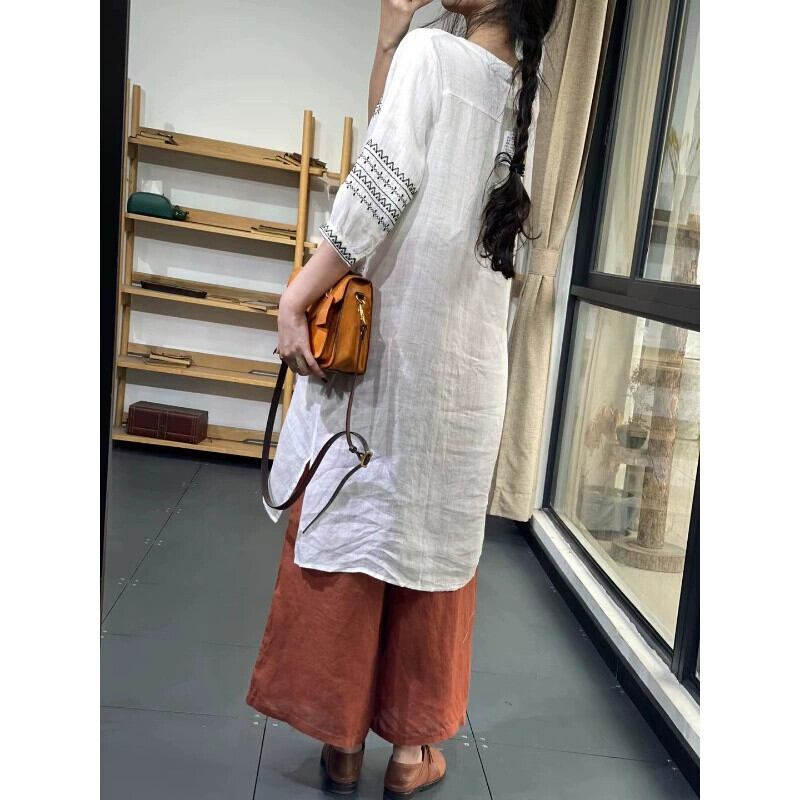 クリアランスリーク〜eseオリジナルのレトロなコットンとリネンの女性のドレス、ゆったりとスリムな刺繍入りVネックリネンミドル丈スカート レッド sine72610717164