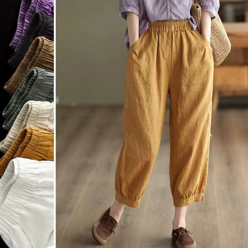 クリアランスリーク〜eseオリジナルのカジュアルな綿とリネンのブルマ女性、ゆったりとしたレトロな無地のリネン9点ハーレムパンツ コットン ショーツ ブルマー ソリッドカラー sine24075061590
