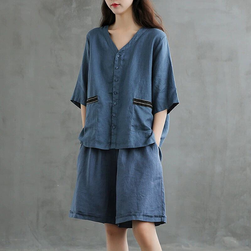 eign trade ese brand テールグッズ カットレーベル レディース 大きいサイズ Vネック 半袖シャツ カジュアル ワイドレッグ ショーツ リネン 2点セット 大きめサイズ ブルマー sine20362764661