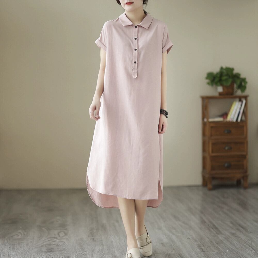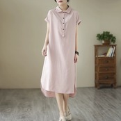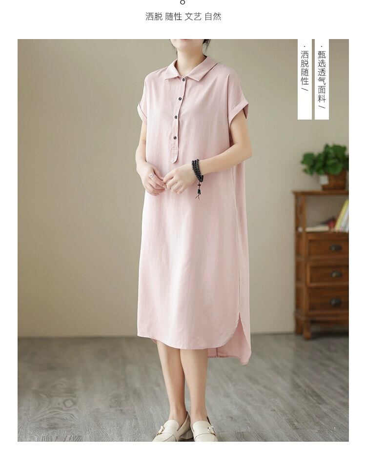 クリアランスリーク〜eseスタイルのオリジナルシングル気質ラペルリネンシャツ薄いロングスカートレディースルーズコットンとリネン半袖ドレス sine23619625982