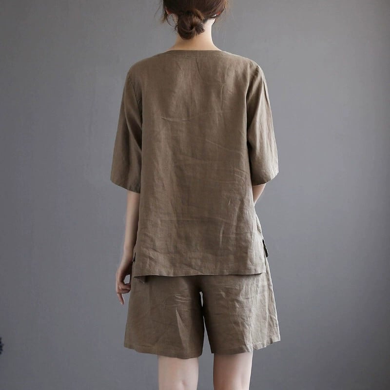 Eign Trade 輸出ブランドテールグッズ女性のルーズ半袖シャツ薄手のトップカジュアル七分丈ショーツ綿とリネンのツーピーススーツ コットン ブルマー sine51643655233