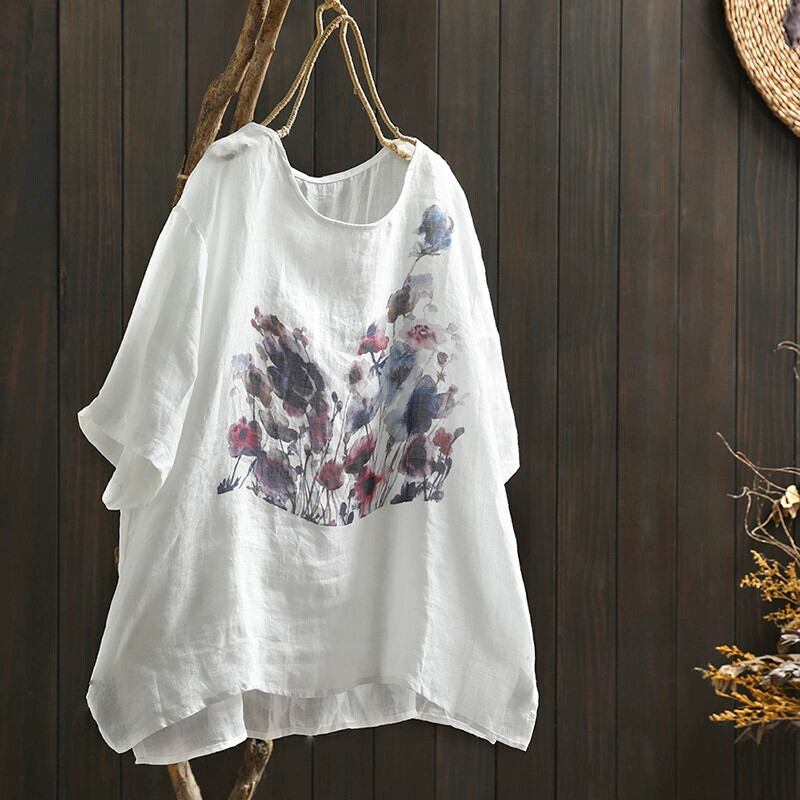 カウンタークリアランスラストシングルレディースレトロカジュアルコットンリネン半袖Tシャツルーズ水墨画リネントップ sine97451518300