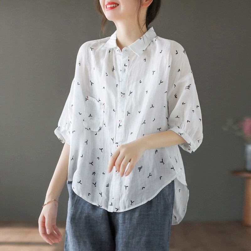 ディスカウントストアショッピングモールレディースカジュアルプリントコットンとリネン半袖シャツルーズで軽いラペルリネントップ sine76555286843