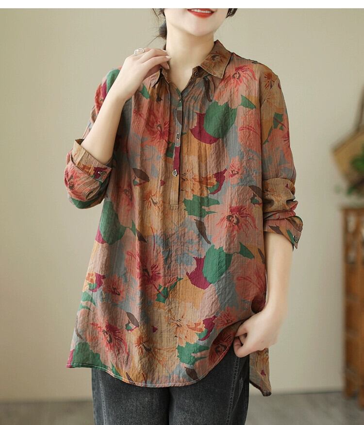 クリアランス漏れ〜カウンター最後の在庫レディースレトロフローラルラペルリネントップカジュアルルーズコットンとリネン長袖シャツ ロング 花柄 sine28311325252