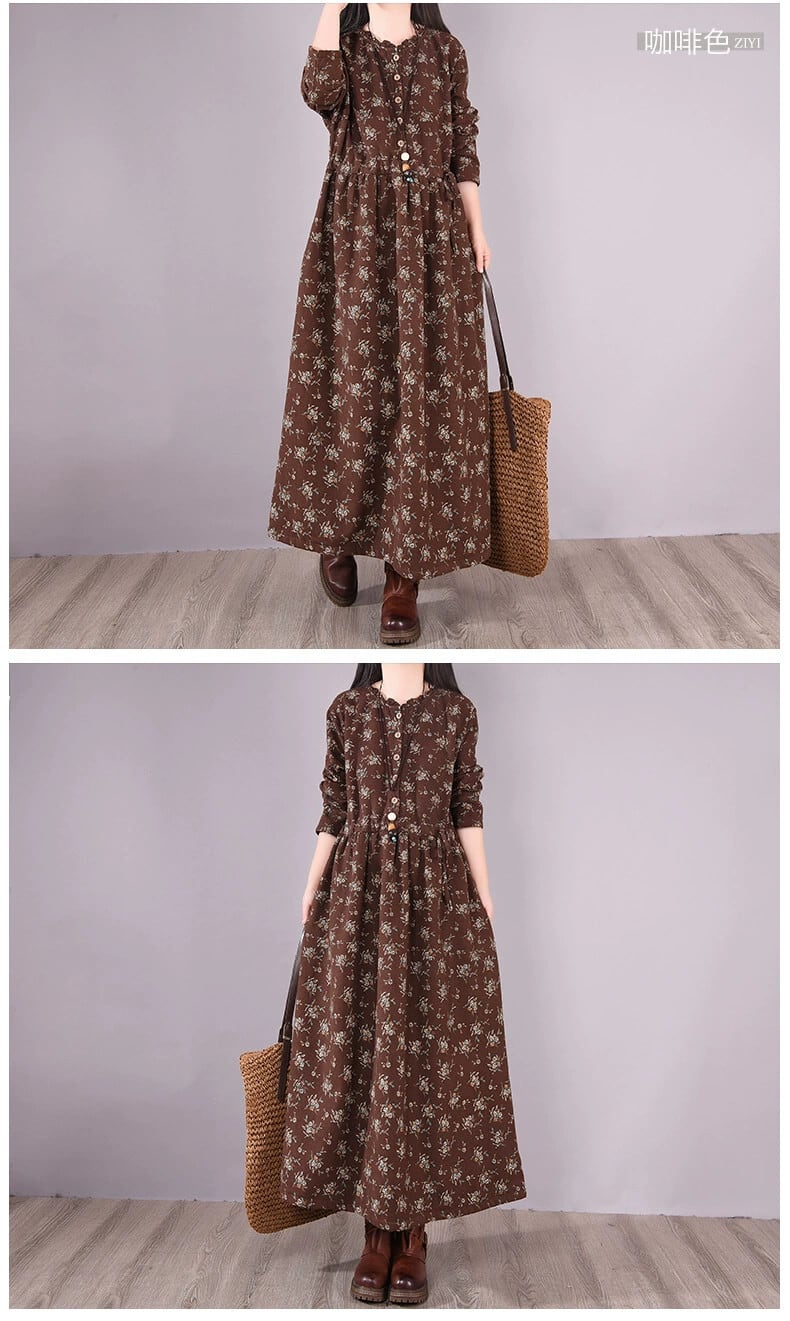 クリアランスリーク〜eseオリジナルのレトロな花柄の綿とリネンの長袖ドレスの女性、暖かいプラスベルベットのリネンロングスカート コットン sine52516353647