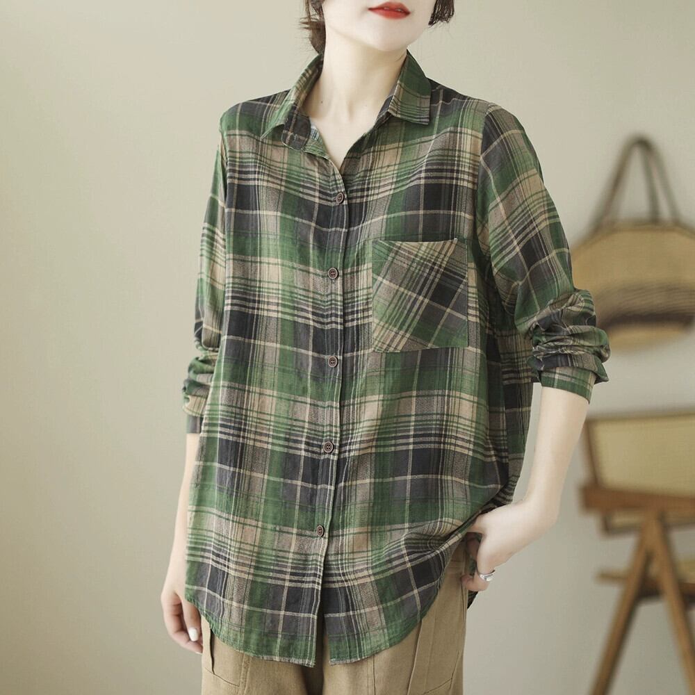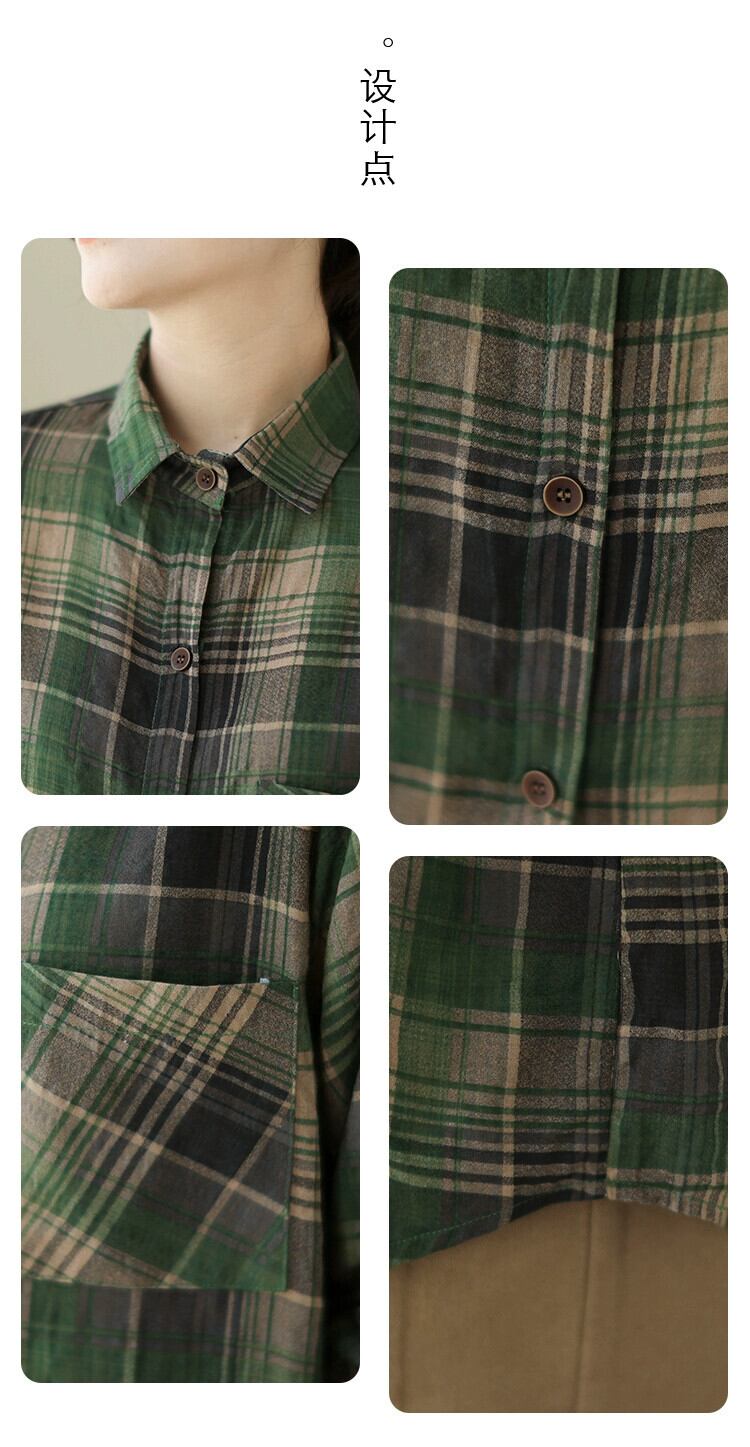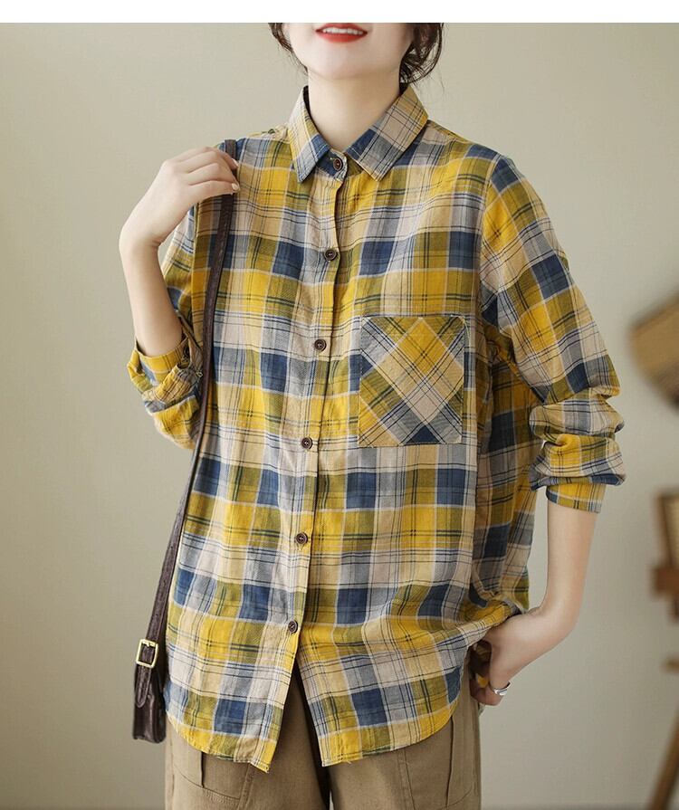 ese とオリジナル eign trade 有名な商品の女性の文学的なチェック柄の綿とリネンの長袖シャツカジュアルなルーズ リネン トップス秋 ロング コットン オータム 秋物 sine23041258015
