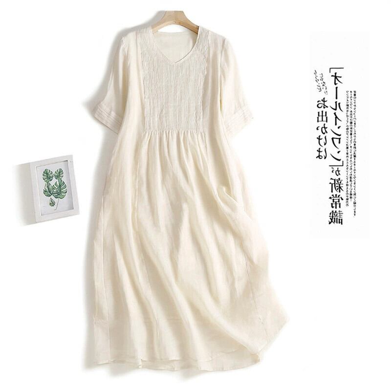 ese and eign trade ビッグブランドテールグッズクリアランスレトロラミーロングスカートカジュアルアコーディオンプリーツVネックコットンリネンドレス sine88043835546