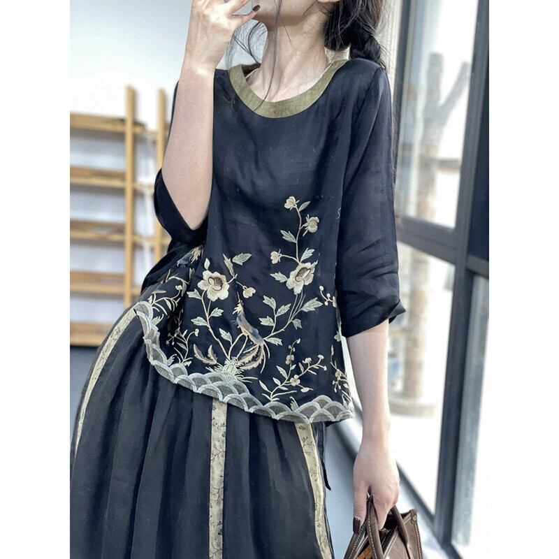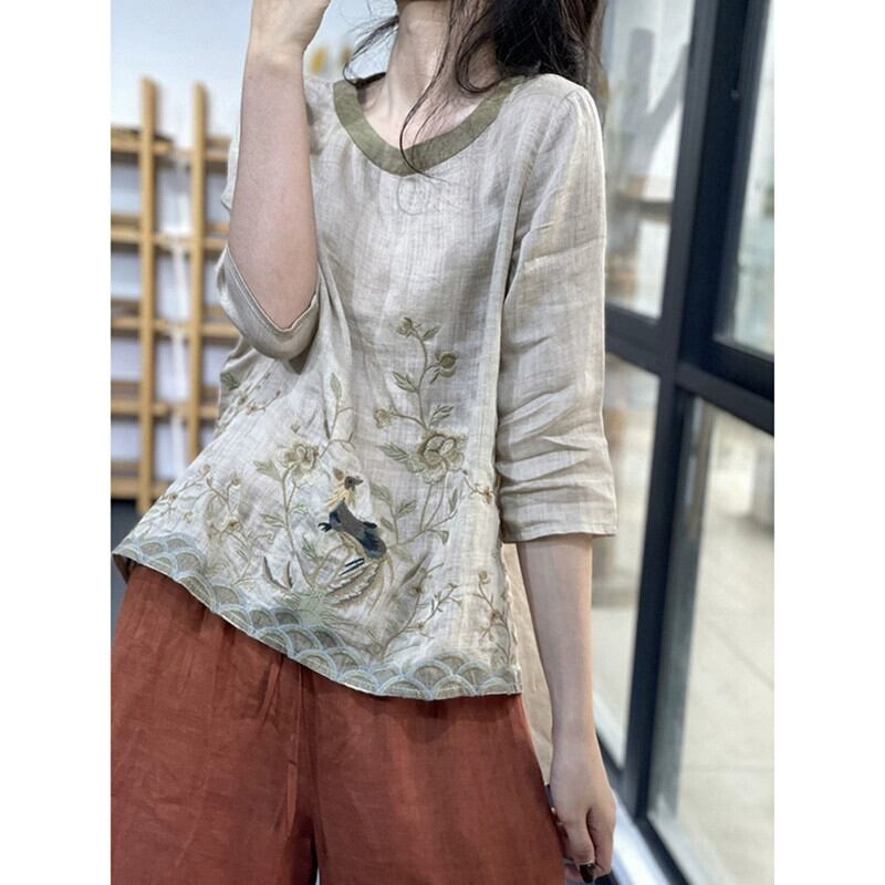 クリアランスハイエンドシングルレディースレトロ刺繍ラミートップカジュアルルーズリネン半袖Tシャツ レッド sine87482358647
